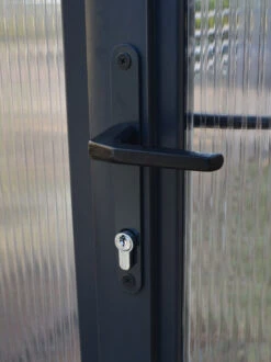 This greenhouse also includes a full galvanized, rust-resistant steel base kit, crucial for adding height, structural support, stability and alignment. It is aesthetically pleasing with its elegant, dark anthracite powder coated finish and its robust aluminum framework. The Glory greenhouse is built from high quality materials for long, lasting use. The greenhouse itself features 10 mm Twin-Wall 100% UV-protected, light-diffusing polycarbonate panels with over 90% light transmission and provides a comfortable, insulated environment for growing your plants. The virtually unbreakable, thick panels also protect plants from harsh weather conditions such as hail, snow and frost and provide additional insulation.